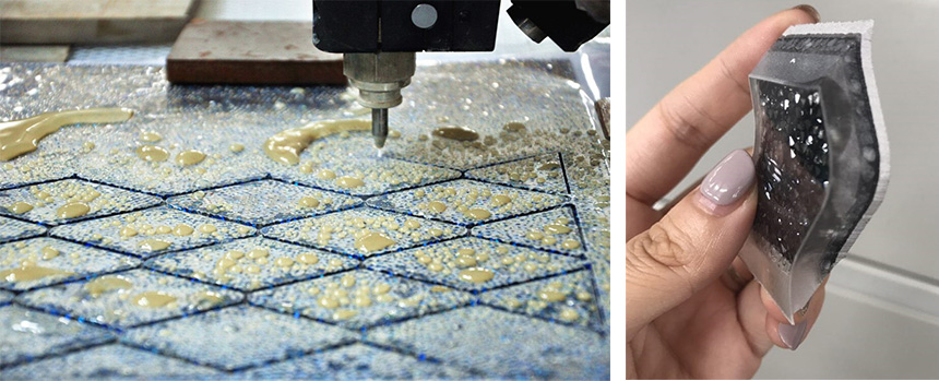 復合材料不僅具有非均勻性復合結構,而且復合層中材料的熱熔點也不一致,所以不宜用熱切割的加工法。而傳統的加工方法容易產生兩種缺陷:一是切口損傷,即切口邊緣附近產生出切口分層、撕裂、毛刺、拉絲等現象;二是層間分層,即復合材料層與層間發生的分離,使構件內部組織變松,降低構件強度等。激光雖可以用于切割部分復合材料,如使用激光切割會使熱影響區纖維與基體脫粘,材料出現焦化和熱裂現象,切口寬度不均,切割端面會形成碳化層,損傷復合材料;使用等離子切割會無法切割陶瓷材料,使材料局部破壞而造成性能降低。但是水切割卻能夠完美地解決這些問題。 水晶玻璃膠質復合材料