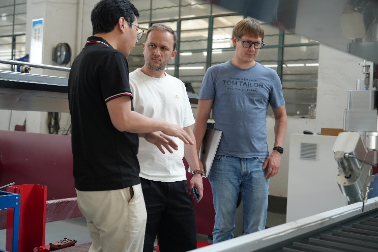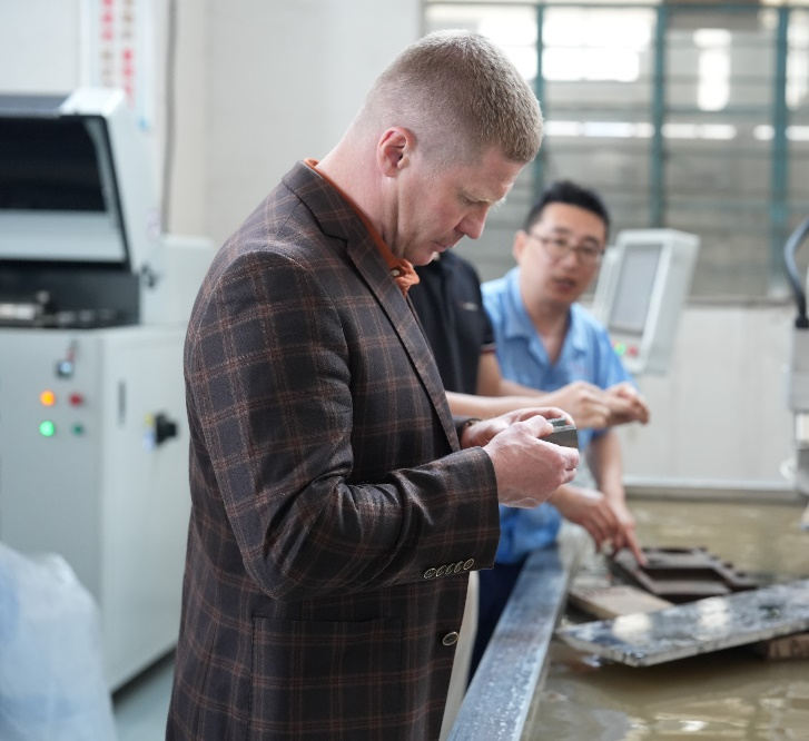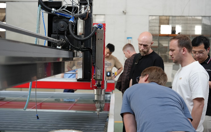 本次參觀中,歐洲團(tuán)隊實地考察了生產(chǎn)車間與技術(shù)實驗室,深入了解設(shè)備研發(fā)流程與質(zhì)量管控體系,并現(xiàn)場觀摩了五軸水刀切割復(fù)合材料的演示。雙方圍繞新能源設(shè)備切割需求展開技術(shù)研討,永昌團(tuán)隊針對客戶提出的材料特性與精度要求提供專業(yè)的定制化方案,獲得了高度認(rèn)可。目前雙方已在定制化生產(chǎn)線方面達(dá)成初步合作意向,后續(xù)將進(jìn)一步推動達(dá)成中歐高端裝備技術(shù)協(xié)作。